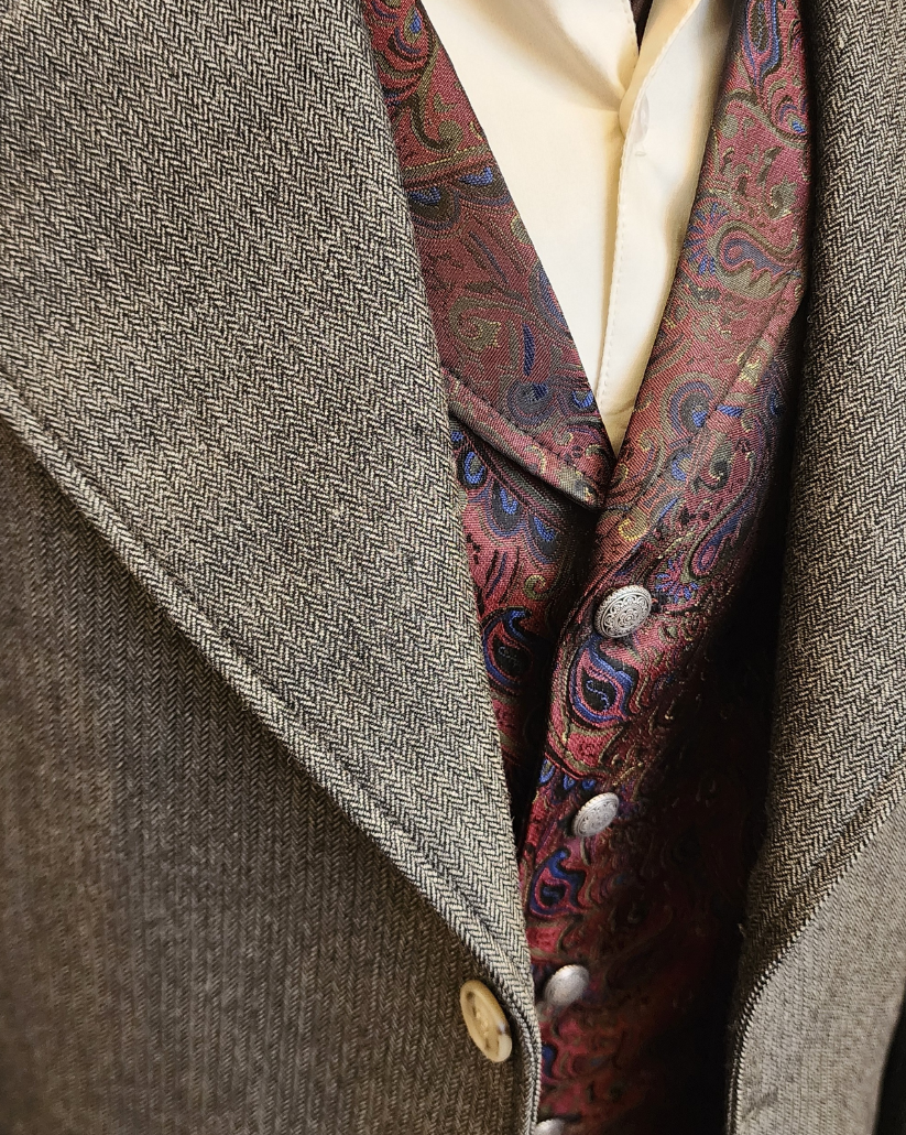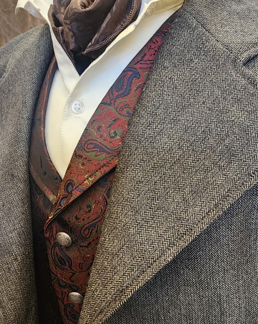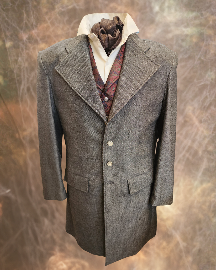 Men's Green Mini Herringbone Wool Frock Coat - Victorian, Western Heritage StyleTimeless Tailored Style. Elevate your wardrobe with this men's Green Mini Herringbone Wool Frock Coat, featuring classic Western and Victorian-inspired tailoring and refined craftsmanship. Designed for versatility, this coat delivers a commanding profile that layers beautifully over shirts and vests for a formal look or pairs seamlessly with jeans for a fashion-forward style.Crafted in a premium wool with a subtle Mini Herringbone weave, the fabric offers a beautiful structure, professional drape, and natural warmth, making it an excellent choice for cooler weather. The fitted chest and waist lead into a flared skirt, echoing the iconic 19th-century frock coat worn by gentlemen, ranchers, and statesmen alike.Proudly made in USA in our Los Angeles workshop, this coat is a sustainable men's frock coat and a true heritage menswear essential. It is perfect for Western wear, English tailoring, or historical events and is also ideal for theatre, weddings, or everyday statement style.Bring history forward with the Green Mini Herringbone Frock Coat, merging Victorian heritage, Western tradition, and modern refinement.Pictured with a Brocade Rust, Blue, Green vest, a brown wild rag and an ecru tuxedo shirt.