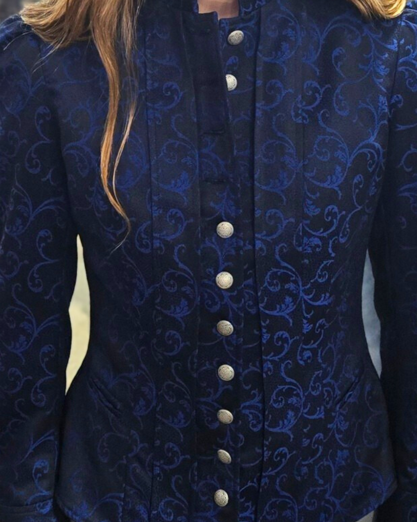 The Blue Brocade Victoriana Jacket blends turn-of-the-century fashion with a bold, modern edge. Cut with a flattering peplum waist, this jacket accentuates curves while offering a tailored, feminine silhouette. The shimmering blue brocade fabric adds richness and texture, making it just as striking for historical events as it is for modern streetwear. Intricate filigree buttons line the front, while subtle cuffs add detail to the sleeves, capturing the elegance of Victorian-inspired tailoring .This versatile piece pairs beautifully with leggings and boots, denim, or a flowing skirt, allowing you to style it for everything from a costume event to a contemporary night out. Make a statement in the Victoriana Jacket, where historic charm meets modern confidence. A Note on Fabrics: Some of our textiles are one-of-a-kind treasures and may not be available again or for custom orders. Our Victoriana Jacket sizes for women run as follows:30 = size 432 = size 634 = size 836 = size 1038 = size 1240 = size 1442 = size 16Remember sizes equate to bust size, call if further assistance is required.